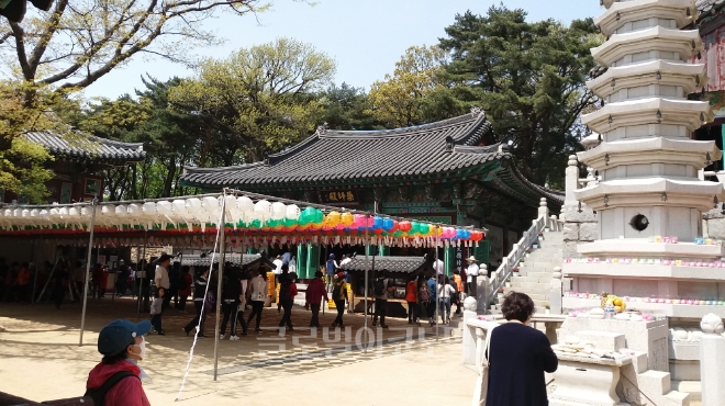 이미지 확대보기2019년 5월 12일 부처님오신날 서울 금천구 삼성산 호압사 경내 모습. 올해와 달리 인파로 북적이는 모습을 보였다. 사진=김철훈 기자