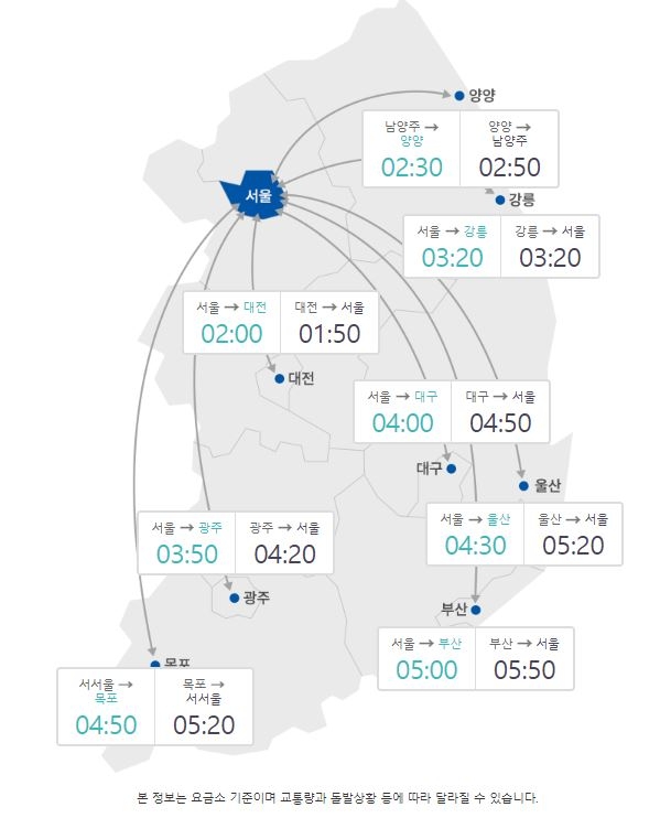 오전 11시 기준 요금소 기준 주요 도시 간 예상 소요 시간은 하행선 △서울~부산 5시간 △서울~대구 4시간 △서울~광주 3시간50분 △서울~대전 2시간 △서울~강릉 3시간20분 △서울~울산 4시간30분 △서울~목포 4시간50분이다.