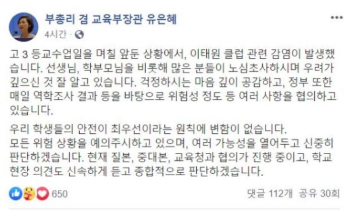 그는 이어 "걱정하시는 마음 깊이 공감하고, 정부 또한 매일 역학조사 결과 등을 바탕으로 위험성 정도 등 여러 사항을 협의하고 있다“며 "우리 학생들의 안전이 최우선이라는 원칙에 변함이 없다"고 덧붙였다.