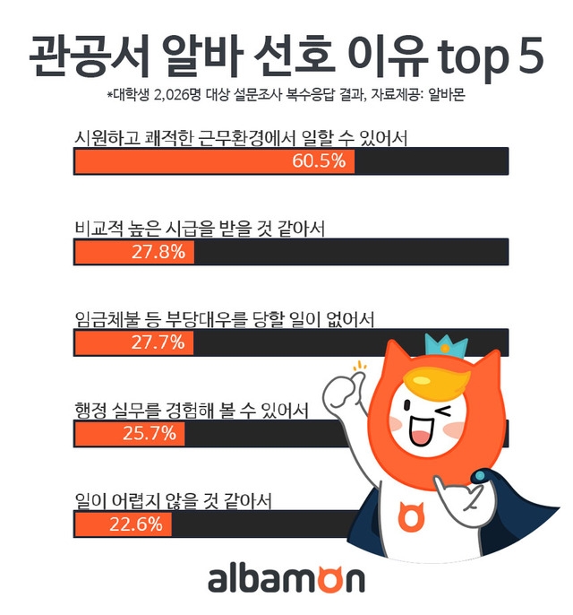대학생들이 관공서 알바를 선호하는 가장 큰 이유는 ‘시원하고 쾌적한 근무환경에서 일할 수 있어서’ 60.5%(복수응답), ‘비교적 높은 시급을 받을 것 같아서’ 27.8%, ‘임금체불 등 부당대우를 당할 일이 없기 때문에’ 27.7%, ‘행정 실무를 경험해 볼 수 있어서’ 25.7% 등이었다.