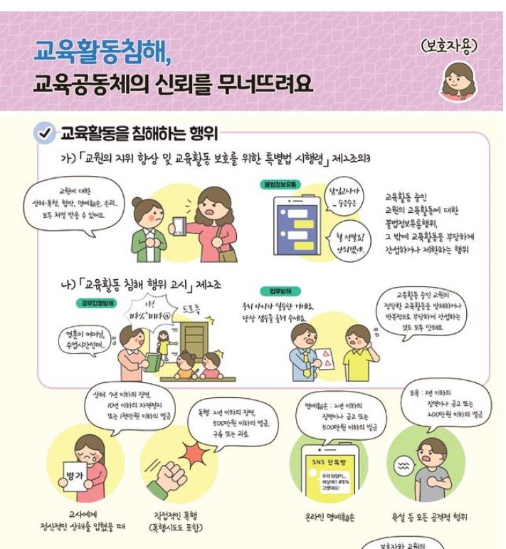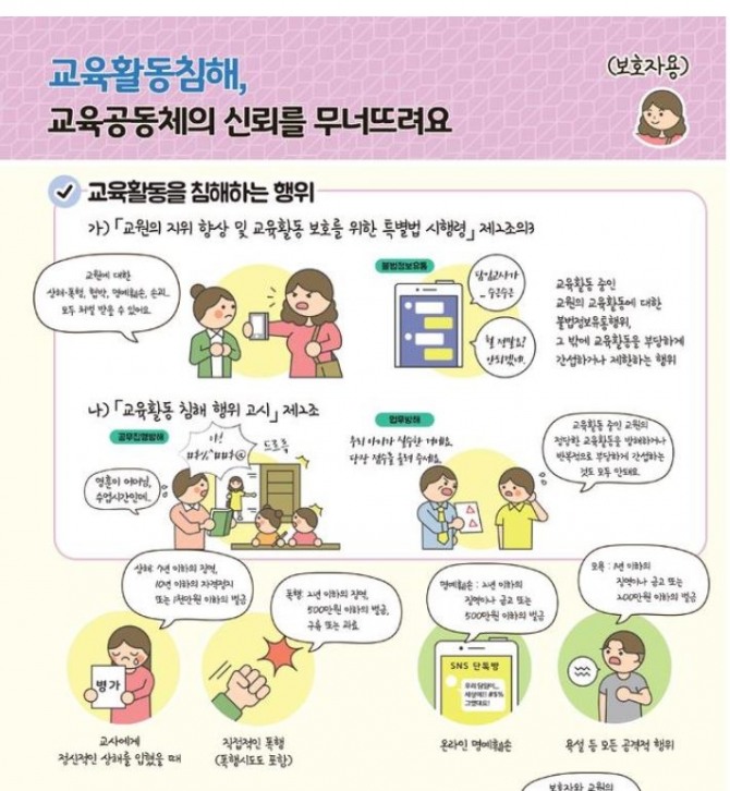주로 학부모들은 학교폭력대책자치위원회 처분과 교원의 생활지도 등에 불만을 품고 합의금을 요구하거나 과도한 소송을 제기했다.