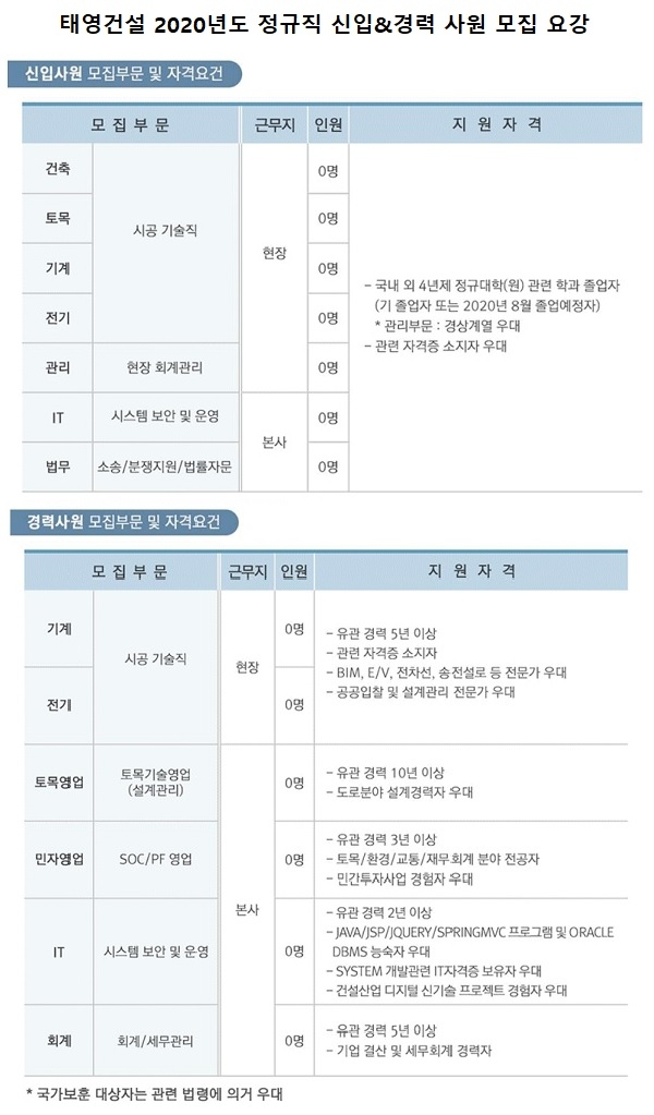 서류 접수는 오는 6월 2일까지이며, 태영건설 홈페이지에서 온라인으로 입사지원하면 된다.
