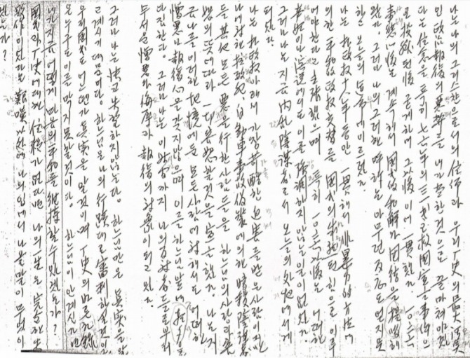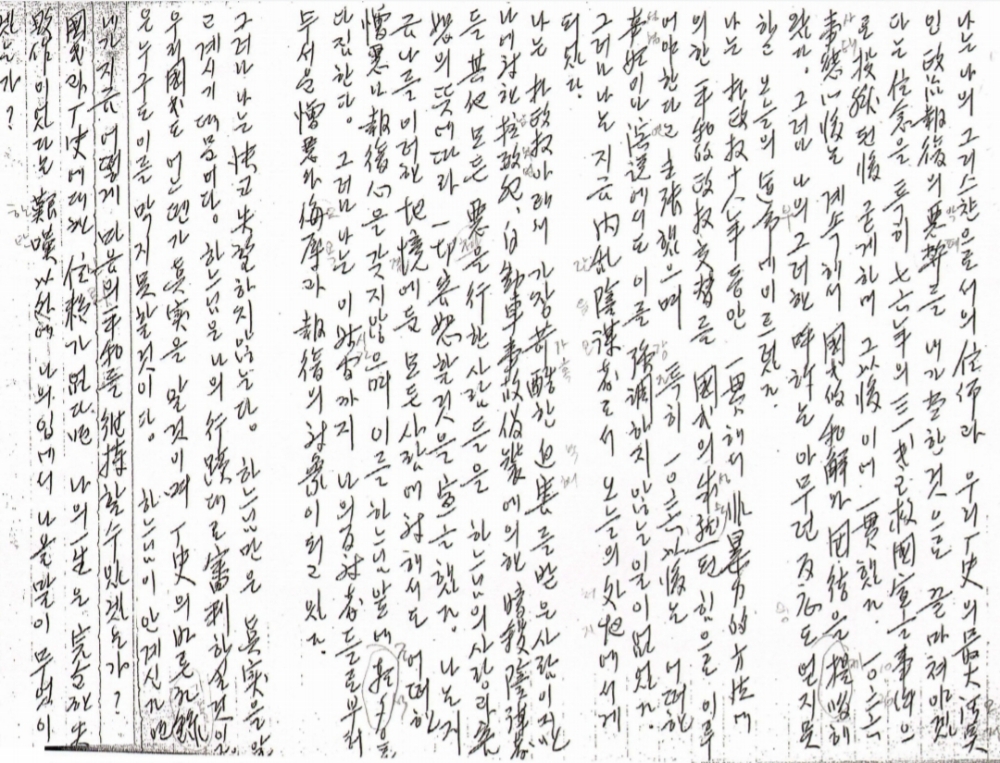 또 "나는 지금 나를 이러한 지경에 둔 모든 사람에 대해서도 어떠한 증오나 보복심을 갖지 않고, 이를 하느님 앞에 조석으로 다짐한다"며 "그러나 나는 이 시간까지 나의 반대자들로부터 무서운 증오와 모욕과 보복의 대상이 되고 있다"고 했다.