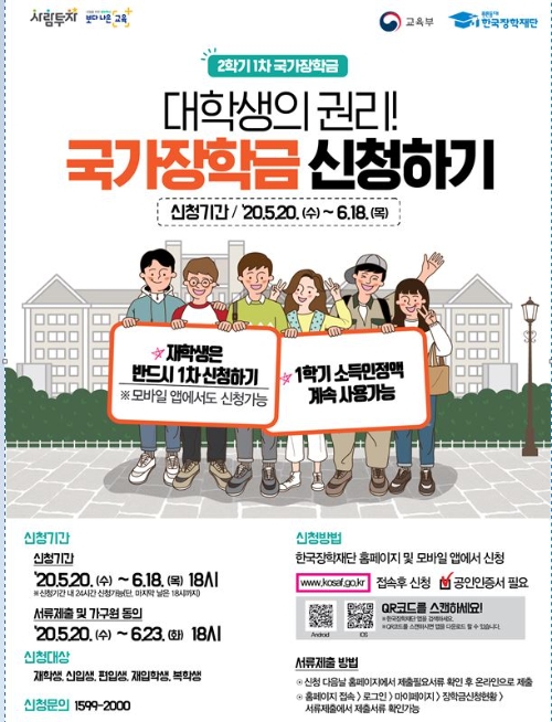 신청 대상은 재학생과 신입생, 편입생, 재입학생, 복학생으로, 재단 누리집(www.kosaf.go.kr)과 앱을 통해 24시간 신청이 가능하다. 접수는 오는 20일부터 6월 18일 오후 6시까지 신청이 가능하다.