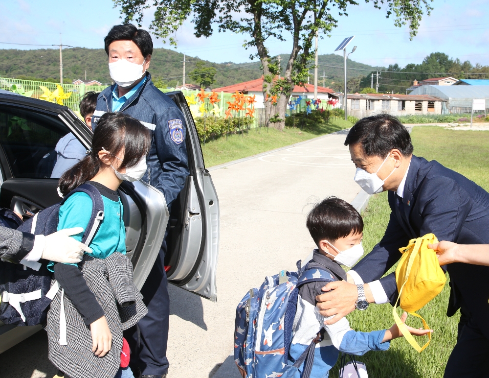 아름 학생에 뒤이어 학생들이 하나 둘 씩 모습을 드러냈다. 현장에는 장석웅 전남도교육감과 교육청, 학교 관계자들이 나와 아이들을 반갑게 맞았다. 장 교육감은 “학교 오고 싶었지” “반가워.”를 연발하며 아이들과 일일이 눈을 맞췄다. 아이들 손에는 도교육청이 미리 준비한 건강지킴꾸러미(마스크, 손소독제, 알콜티슈 등)도 들려줬다.