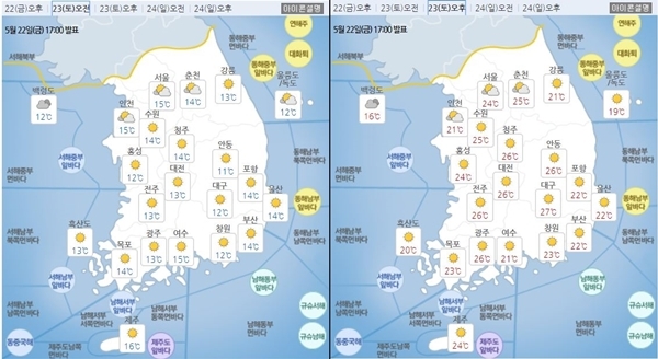 ▲서울 24도 ▲인천 21도 ▲춘천 25도 ▲강릉 21도 ▲수원 25도 ▲청주 26도 ▲대전 26도 ▲전주 24도 ▲대구 27도 ▲포항 22도 ▲광주 26도 ▲목포 23도 ▲부산 22도 ▲울산 22도 ▲제주 24도 ▲울릉도·독도 19도 등이다.