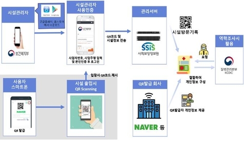 출입기록 정보는 QR코드 발급회사와 사회보장정보원에서 나눠 관리하는데 QR코드 발급회사에서는 이용자의 이름과 전화번호를, 사회보장정보원에서는 시설정보와 QR코드 방문 기록을 각각 관리하게 된다.