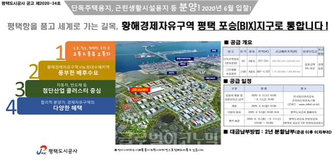 금번 공급대상 용지는 경쟁입찰 방식으로 공급할 예정이며, 6월 3일 오전 10시부터 6월 5일 오후 4시까지 공급신청이 가능하다. 자세한 내용은 공사 홈페이지 분양안내 용지분양 게시판에 게시된 공급공고문을 참조하거나 평택도시공사 분양보상처로 문의하면 된다.
