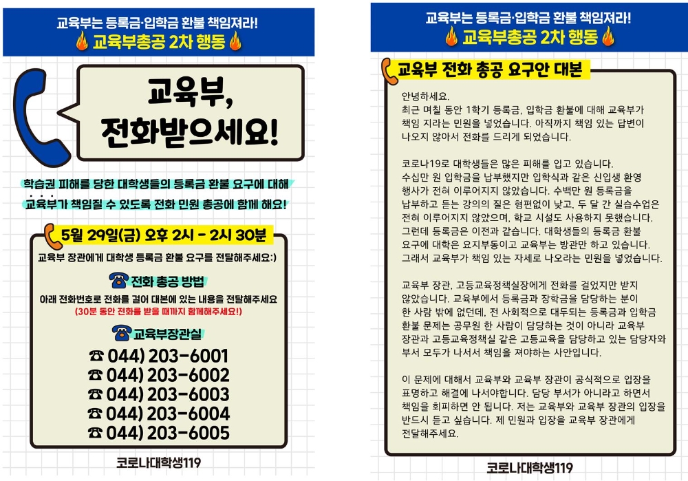 이미지 확대보기코로나대학생119·청년민중당은 29일 "오늘 오후 2시부터 2시30분까지 30분간 '2차 교육부총공'인 전화 민원을 진행했다"고 밝혔다.
