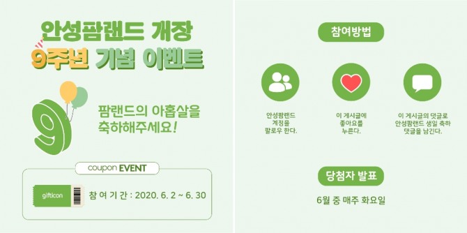 개장 9주년 이벤트로 안성팜랜드 공식 인스타그램에서 안성팜랜드를 팔로우한 후 재미있는 축하 댓글을 남겨주신 분 중 6월간 매주 화요일마다 9명을 추첨해 기프티콘을 증정한다.