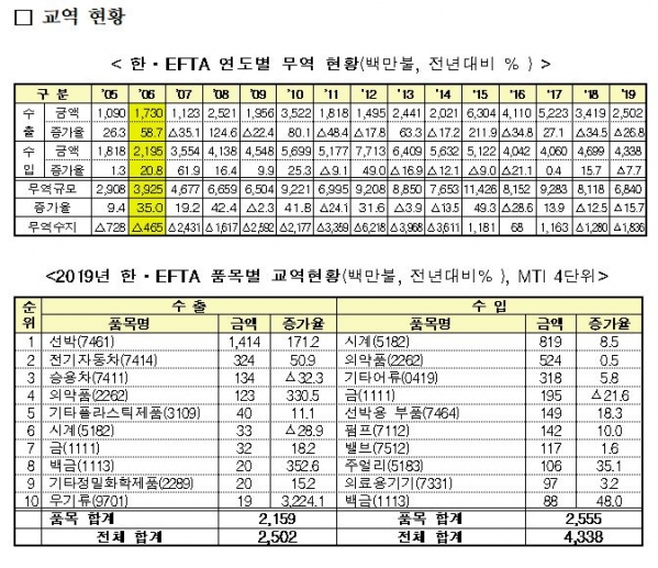 양측간 교역이 2015년에는 100억 달러를 넘었으며 작년에는 FTA 발효 전인 2005년과 비교해 135% 증가하는 등 한-EFTA FTA가 교역규모 확대에 마중물 역할을 한 것으로 평가할 수 있다.