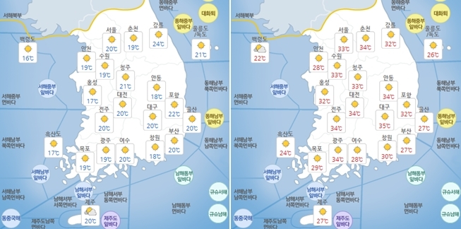 9일 아침 기온은 전국에 걸쳐 16~24도 분포를 보이겠고, 낮 기온은 27~35도를 보이겠다.