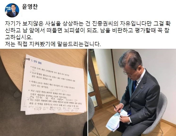 윤 의원은 "저는 직접 지켜봤기에 말씀드리는 것"이라며 문 대통령이 과거 연설 원고를 일일이 고치는 모습과 함께 자필로 수정한 원고 사진을 페이스북에 올리기도 했다.