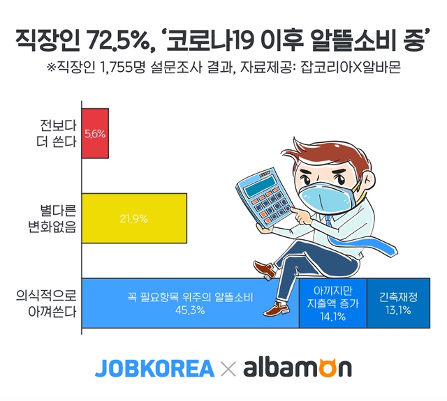 11일 잡코리아가 아르바이트 대표포털 알바몬과 함께 직장인 1755명을 대상으로 ‘코로나19 이후 소비패턴’을 설문한 결과, 45.3%가 ‘꼭 필요하다고 생각하는 항목을 위주로 더 알뜰하게 소비하려고 한다’고 밝혔다.