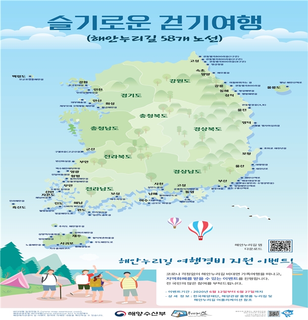 해수부와 해양재단은 해안누리길 여행을 희망하는 127개 가족을 추첨으로 선발해 희망하는 해안누리길 관할 지자체의 지역화폐로 한 가족당 여행경비 20만 원을 지원한다. 해안누리길 여행을 원하는 가족이라면 누구나 12일부터 27일까지 해양관광누리집을 통해 신청할 수 있다.
