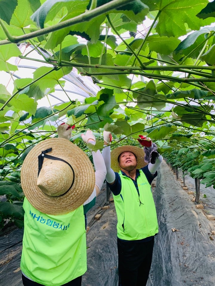이미지 확대보기이날 축산기획부 직원들은 부쩍 더워진 날씨에도 불구하고 농번기를 맞아 인력 수급에 어려움을 겪고 있는 농가들을 위해 10여 명의 직원들이 포도 순 제거작업, 마을환경 정비 등 농업인 지원에 구슬땀을 흘렸다.