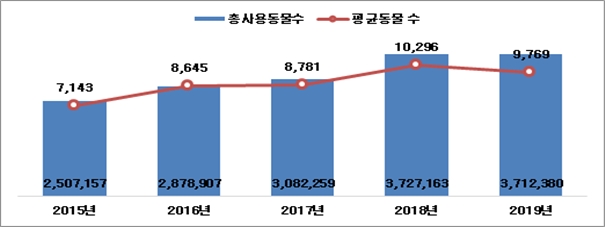 이미지 확대보기농림축산식품부는 15일 국내 동물실험시행기관의 2019년도 동물실험 보호·복지 관련 실태 조사 결과를 발표했다. 그 결과 동물실험을 수행한 기관에서 사용된 실험동물은 371만2000마리로 집계됐다고 밝혔다.