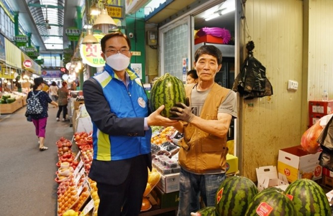 이미지 확대보기조용만 사장과 임직원 30여명은 이날 도마큰시장에서 직접 장보기를 하면서 신선한 수박을 구매해 사회복지시설인 중촌사회복지관에 기증했다.