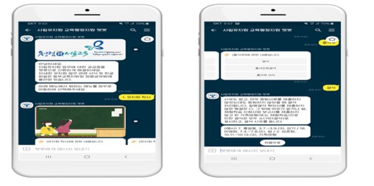 동부교육지원청은 지난해 10월부터 운영 중인 청렴챗봇을 개발한 노하우를 살려 감사팀 직원들이 사립유치원 교육행정지원 챗봇을 자체 개발해 예산을 절감하고, 이용자가 각종 서식 등 관련 자료를 간편하게 실시간으로 확인할 수 있도록 하여 활용도를 높였다.