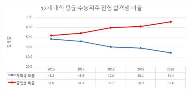 서울대는 2016학년도 수능 정시 전형 합격자 중 재학생이 512명(55.7%)에서 2020학년도에는 374명(43.4%)으로 줄어든 반면 재수생 이상의 졸업생은 2016학년도에 407명(44.3%)에서 2020학년도 488명(56.6%)으로 늘어났다.