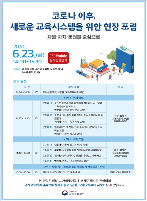 이어지는 주제토론에는 김재은 한국교육학술정보원(KERIS) 디지털교과서부장과 이윤경 참교육을위한전국학부모회 서울지부장, 박대식 성남 위례푸른초 교감, 김윤아 서울 명일여고 3학년생 등이 참여해 온라인 학습, 돌봄, 미래 학교교육 방향 등에 대해 토론한다.