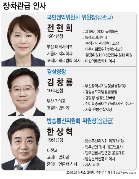방송통신위원회 위원장에 한상혁(59) 현 방송통신위원회 위원장, 경찰청장에 김창룡(56) 부산경찰청장을 후보자로 각각 지명했다.