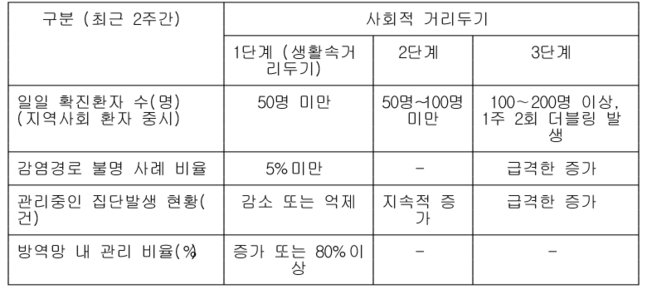 일일 확진자 수 기준으로 1단계는 50명 미만, 2단계는 50명∼100명 미만, 3단계는 100∼200명 이상(1주일 2회 이상 일일 확진자 배 이상 증가 포함) 등이다.