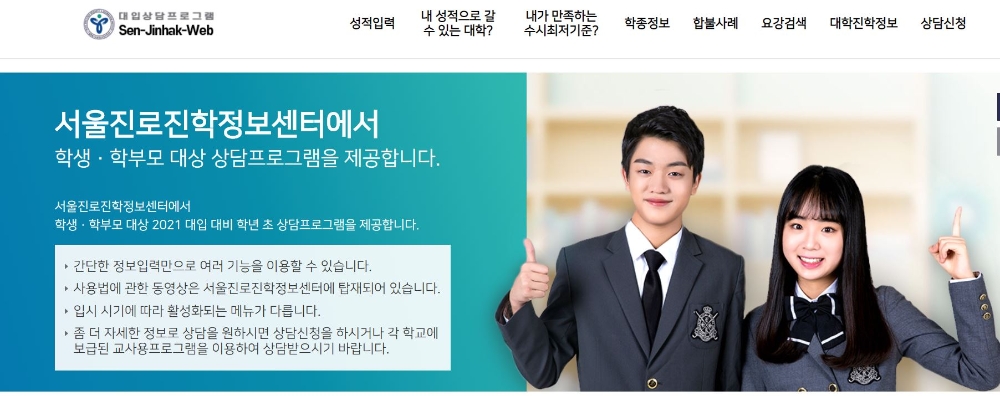 학생·학부모를 위한 웹기반 진학상담 프로그램(Sen-jinhak-Web)은 2021학년도 대입 수시전형에 대비해 ▲내가 만족하는 수시최저학력기준▲학생부종합전형정보▲전년도 합불사례 등을 조회할 수 있다.