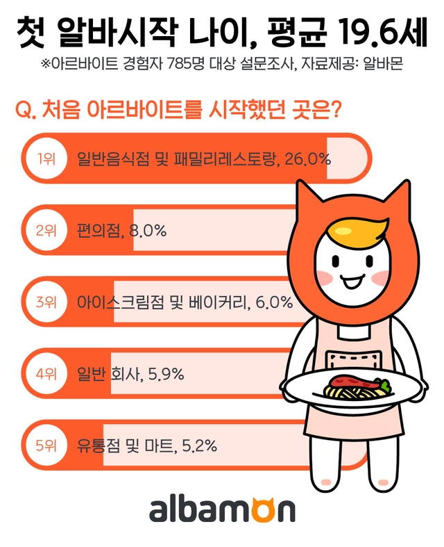 첫 아르바이트를 했던 곳은 ▲일반 음식점‧레스토랑 26% ▲편의점 8% ▲아이스크림‧베이커리‧디저트 전문점 6% ▲일반 회사 5.9% ▲유통점‧마트 5.2% ▲커피 전문점 4.7% ▲치킨‧피자 전문점 3.7% 등의 순이었다.