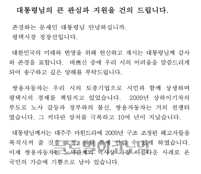 정 시장은 그동안 쌍용자동차는 위기를 극복하기 위해 노조측에서는 복지 축소와 임금반납, 근무시간 조정을, 회사측에서는 자산매각 등을 통해 3,000억원 규모의 자금을 확보하는 등 정상화를 위한 노사 양측의 노력을 건의문을 통해 전달했다.
