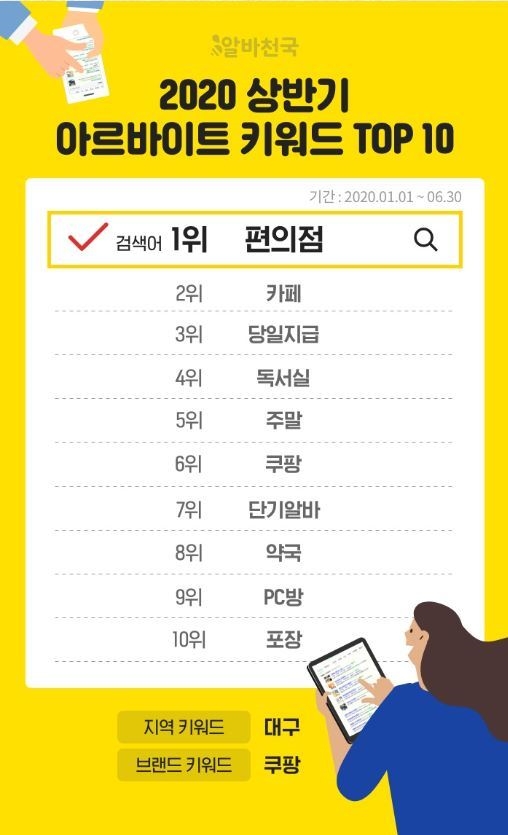 이미지 확대보기구인구직 아르바이트 전문 포털 ‘알바천국’이 2020년 상반기 알바천국 홈페이지와 모바일 앱에서 가장 많이 검색된 키워드를 조사한 결과 ‘편의점’이 1위를 차지했다.