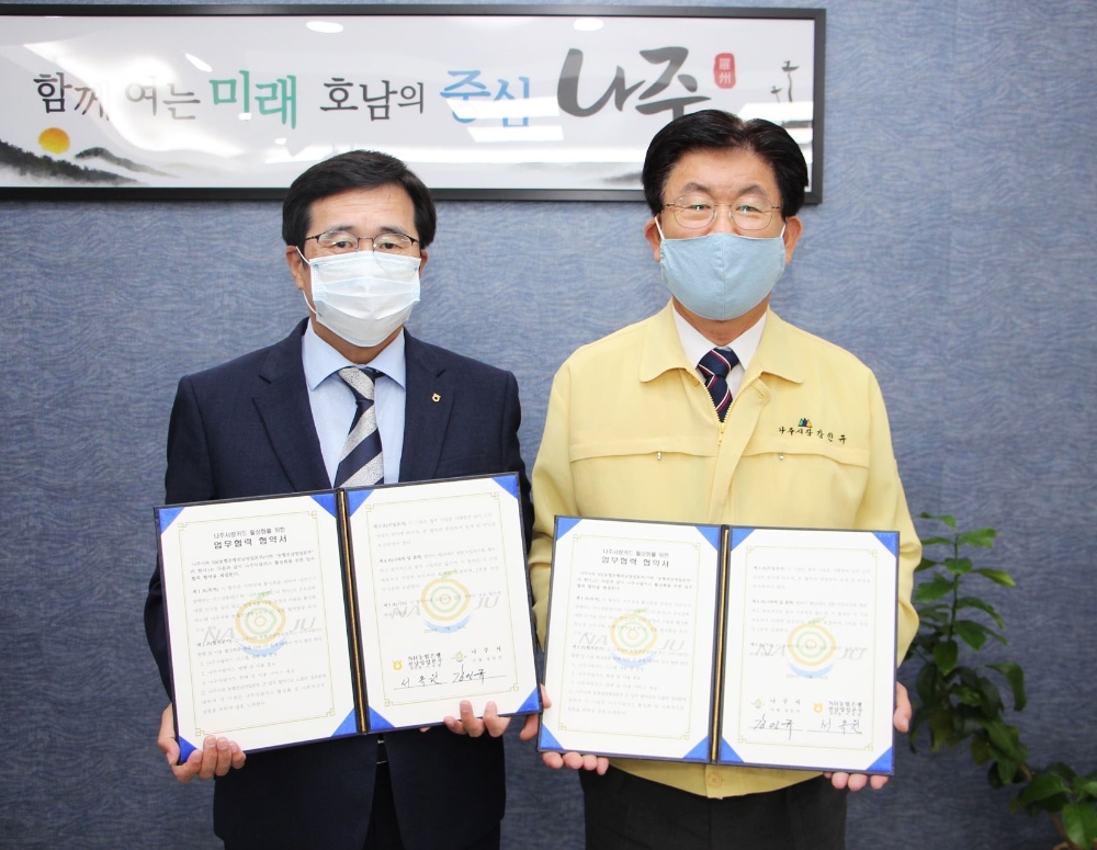 이미지 확대보기NH농협은행 전남영업본부와 나주시는 나주사랑카드 ▲시스템개발 및 운영 ▲발행 및 이용 홍보 ▲판매 및 이용 서비스 제공 등 관련 업무 전반에서 유기적인 협력을 약속했다.