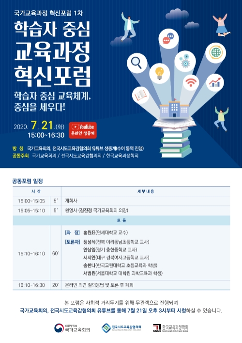 1차 포럼은 오는 21일, 오후 3시 서울 은평구 서울창의예술교육센터에서 ‘학습자중심 교육체계, 중심을 세우다’란 주제로 열리며, 국가교육회의와 전국시·도교육감협의회 유튜브를 통해 무관객 온라인 생중계 된다.