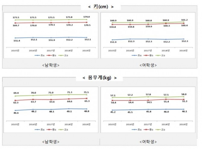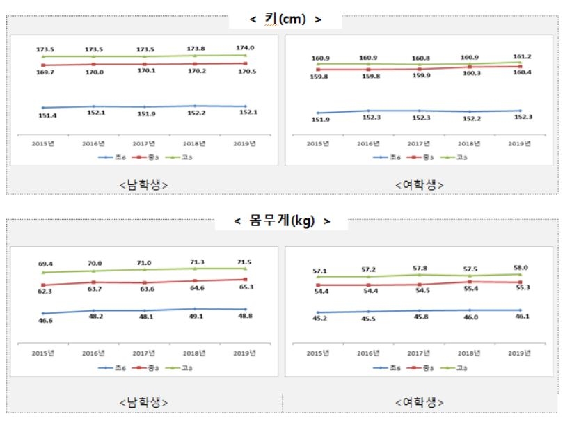 학생들의 성장․발달 정도를 보면 최근 5년 동안 초등학생의 성장세는 큰 변화가 없었으나 , 중학생은 남녀 모두 지속적으로 신장이 늘어났다. 고등학생도 지난 2017년 이후 남녀 모두 증가했으며, 학교급별 최고 학년의 체중은 5년 전에 비해 남녀 모두 증가했다.