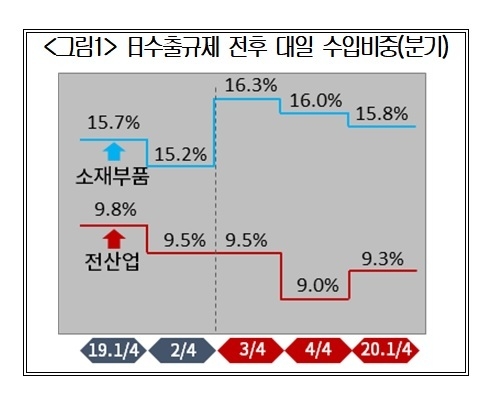 대한상공회의소가 26일 발표한 '일본 수출규제 1년 산업계 영향과 정책과제'에 따르면 소재부품의 대일 수입 비중은 작년 1분기 15.7% → 2분기 15.2% → 3분기 16.3% → 4분기 16%로 작년 7월 수출규제 이후 소폭 높아진 것으로 나타났다.