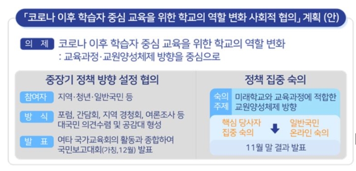 이번 협의에서는 포스트 코로나 시대를 살아갈 학습자를 중심으로 ▲학습자가 무엇을 어떻게 배워야 하는가(교육과정)▲학습자를 지원할 교사는 어떻게 준비되어야 하는가(교원)▲역량 있는 교사를 양성할 체제는 어떤 모습이어야 하는가(교원양성체제 개편)’가 집중 논의했다.