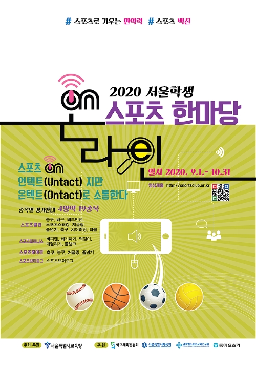 이번 행사는 코로나19로 기존 형식의 대면 접촉 학교스포츠클럽대회가 어려워지자 ‘스포츠 ON, 언택트(Untact)지만 온택트(Ontact)로 소통한다’라는 슬로건으로 오는 9월~10월 사이에 개최된다.
