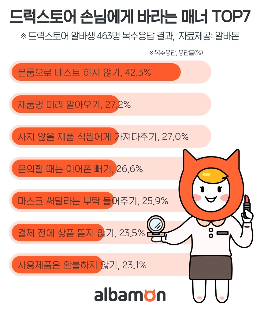 이미지 확대보기알바몬이 7일 드럭스토어 알바생 463명을 대상으로 설문한 결과, 42.3%(복수응답)가 고객에게 바라는 매너로 '본품으로는 절대 테스트하지 않기'를 꼽은 것으로 나타났다.