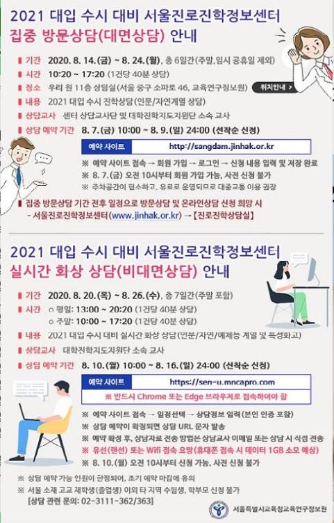 상담 예약을 하지 못한 수험생은 서울진로진학정보센터(www.jinhak.or.kr)에서 연중 운영하는 온라인 상담을 신청하거나 방문 상담을 신청하면 상담을 받을 수 있다.
