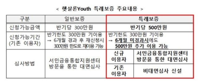 햇살론 유스 일반보증은 반기당 300만 원이지만 특례보증은 500만 원이다.