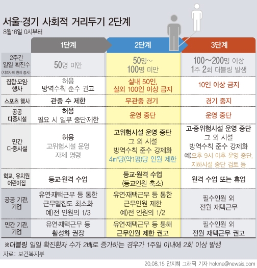 이미지 확대보기이날 0시부터 사회적 거리두기를 2단계로 격상한 서울과 경기도는 앞으로 당분간 일정 규모 이상의 식당, 종교시설, 학원, 영화관 등을 이용할 때도 방역수칙 및 관리에 더 신경을 써야 한다.