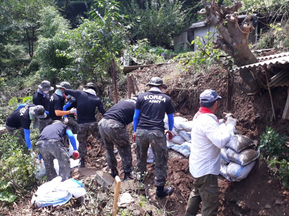 이날 군 장병들과 공무원들은 지난 7월 29일부터 8월 9일까지 집중호우로 인해 피해를 입은 사유 시설 내 토사 유출 제거, 옹벽 무너짐으로 인한 잔재물 정리, 배수용 고랑내기 등의 작업을 실시했다.