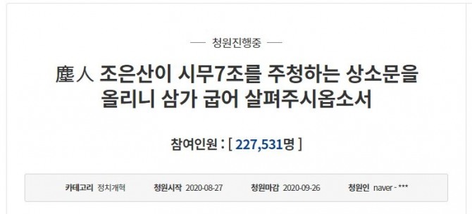 이날 오전 11시 기준 '진인(塵人) 조은산이 시무 7조를 주청하는 상소문을 올리니 삼가 굽어 살펴주시옵소서'라는 제목의 청원에는 22만 7000여명이 서명했다. 이 청원은 전날 올라왔다.