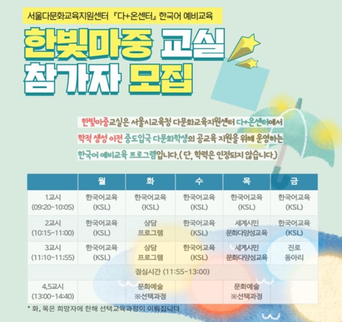 한빛마중교실 참가대상은 서울에 거주하며 한국어 의사소통에 어려움을 겪고 있는 학적생성 이전 중학교 학령의 중도입국 청소년이다.