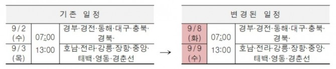 이에 따라 2일로 예정된 경부·경전·동해·충북선 등은 8일로, 3일로 예정됐던 호남·강릉·장항선 등 예매는 9일로 각각 연기됐다.