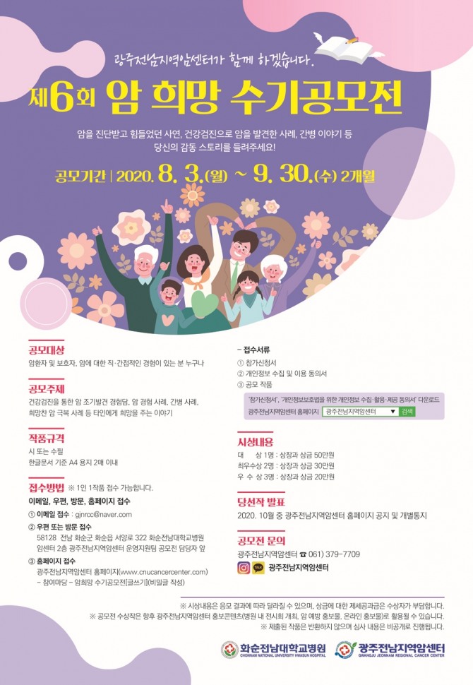 응모하려면 이메일 또는 우편접수(화순전남대병원 2층 암생존자통합지지센터)하거나, 직접 방문해 제출하면 된다. 선정 내용은 이달 중순에 개별 연락한다.