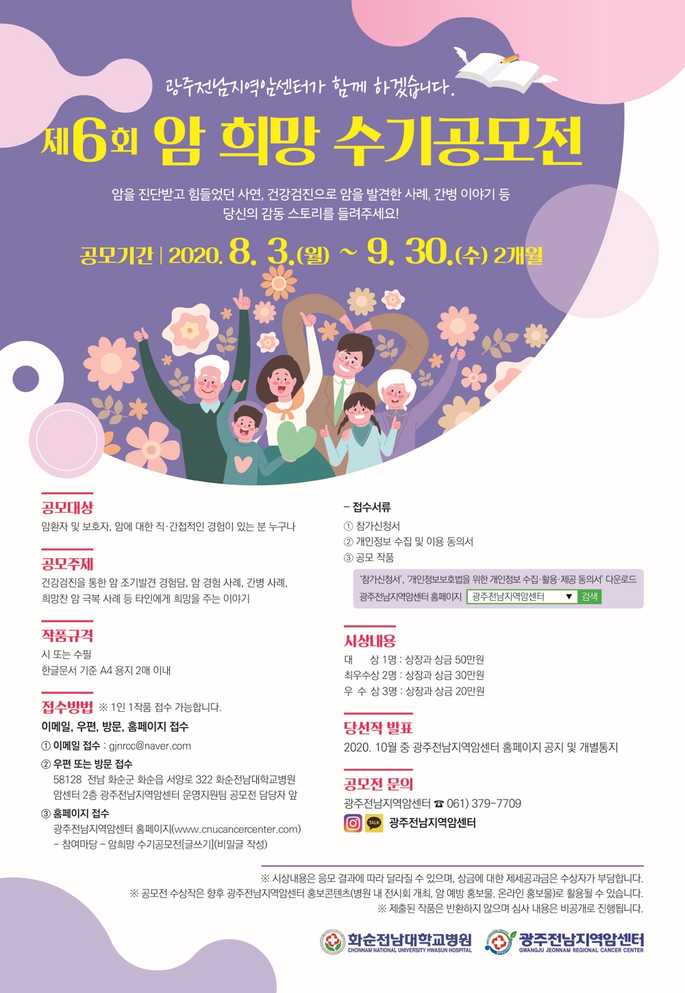 응모하려면 A4용지 2매 이내의 수필 또는 시를 이메일 또는 우편접수(전라남도 화순군 화순읍 서양로 322번지 광주전남지역암센터 2층 운영지원팀) 하면 된다.