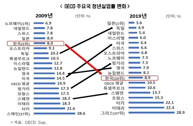 청년실업률이 높아진 6개 국가는 우리나라를 포함, 그리스 10.1%포인트, 이탈리아 4%포인트, 터키 0.6%포인트, 노르웨이 0.4%포인트, 룩셈부르크 0.1%포인트였다.