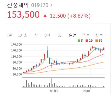 올해 초 7000원대에서 거래되던 신풍제약 주식은 20배 이상 올랐다.