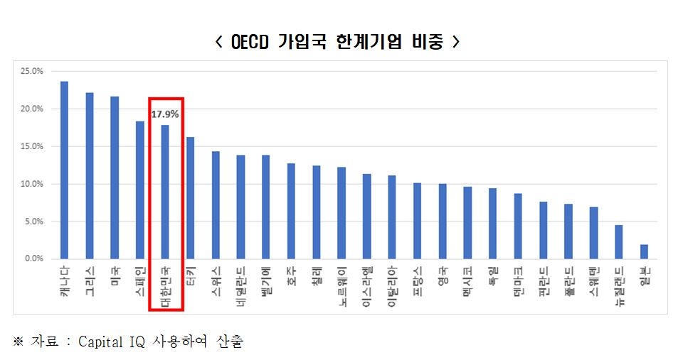 OECD 평균 한계기업 비중은 12.4%로 우리나라가 5.5%포인트 높았고, 비중이 가장 낮은 일본의 1.9%보다는 16%포인트나 높았다.
